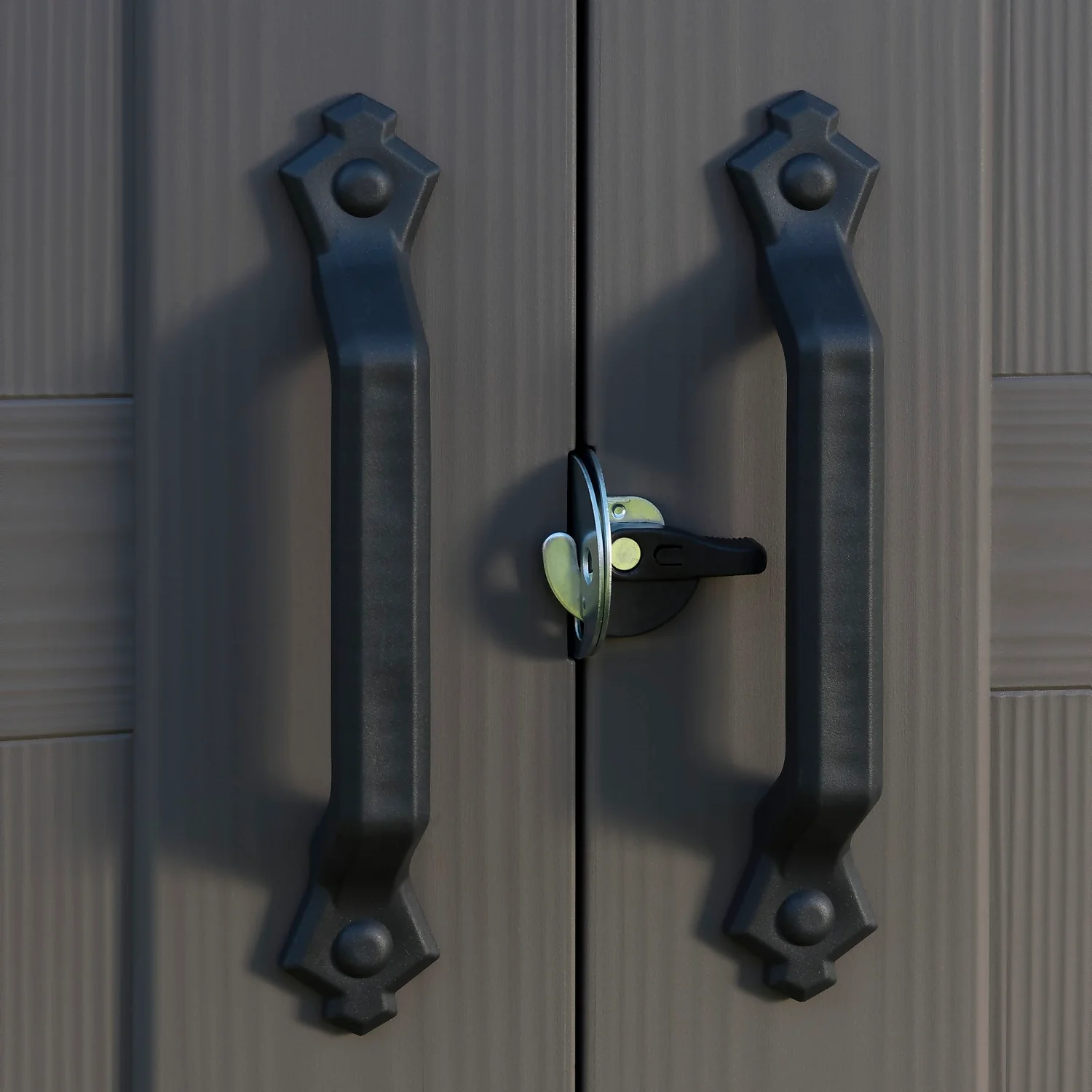 - Elegant wood effect exterior with double doors, plus ventilation grills for air circulation