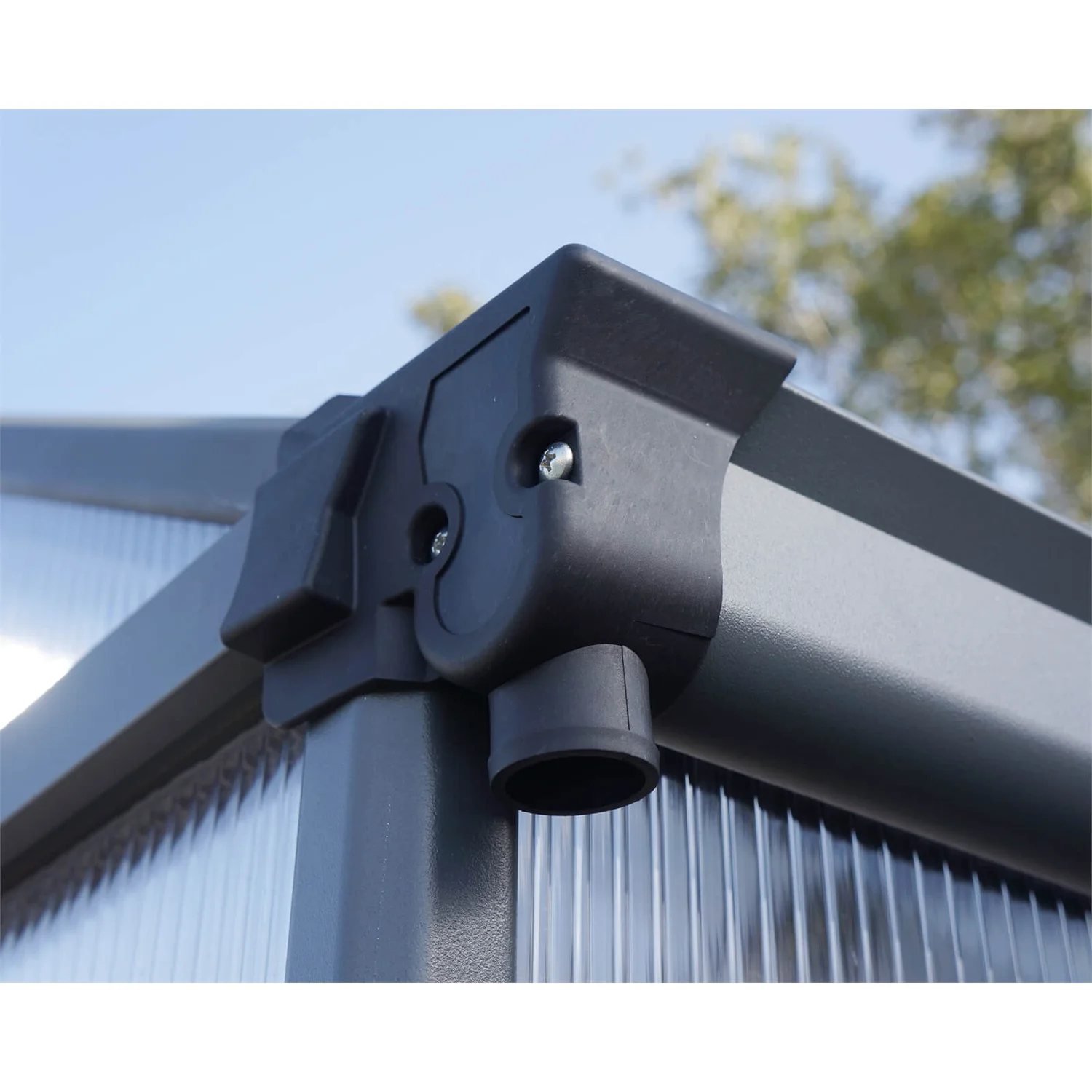 - Virtually unbreakable, 10 mm hail resistant & high impact twin-wall polycarbonate panels, 100% UV protected, provide extra protection and ideal insulation